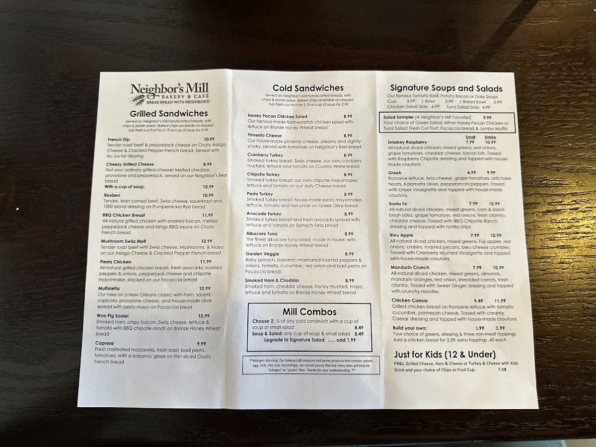 Step inside Neighbor's Mill Bakery & Cafe, where comfort food meets fresh, artisan flavors. With a cozy atmosphere and a menu that brings together the best of homemade bakery treats and savory café options, there's something to satisfy every craving. From freshly baked breads and pastries to hearty breakfast options and light lunches, every item is made with care and the finest ingredients. The Neighbor's Mill Bakery & Cafe Menu offers a delightful variety, including signature sandwiches, salads, and of course, decadent desserts to round off your meal. Whether you're in the mood for a leisurely breakfast or a quick bite during the day, you'll find plenty of choices to enjoy, each crafted to bring a smile to your face.